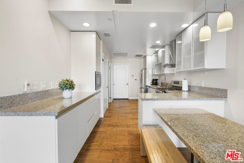 A modern 2-story condo with dual master suites, mountain and courtyard views, exclusive use of a sizable backyard and central location in the heart of downtown Alhambra welcomes the discerning buyer to Casita Zen, a 2015 built mixed-use community. Sleek Euro-style kitchen with stainless steel LG 5-burner stove, a range hood, refrigerator and built-in microwave offers ample counter and storage space for the home cook. Cozy up in the built in dining nook, entertain in comfort and style in your enviable outdoor space, the largest of only 4 in the complex. A powder room and coat closet services this level. The 2nd level features 2 spacious bedrooms and ensuite baths w/ Grohe fixtures, a laundry closet w/ stacked LG washer & dryer and a den, perfect for a home gym or office. Wood-patterned ceramic tiled floors in the living, dining, kitchen and baths, LED recessed lighting throughout, Milgard double pane windows, closet organizers, Tagaki tankless water heater and 2 assigned parking spaces complete this contemporary home. Residence B218 is located on the same level as Casita Zen's trellised courtyard featuring reflective Koi ponds. EV charging stations and guest parking are available on the ground floor.