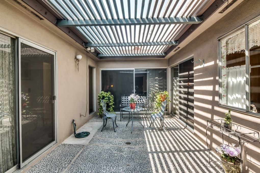 Beautiful and stylish single story Mid-Century Modern condominium with a striking atrium patio. Enjoy condominium living with the feeling of a single family detached home through its direct street frontage. Conveniently located to restaurants, markets, and shops. Turnkey condition and features spacious living room and dining area looking into atrium patio, master bedroom with full bathroom, central HVAC, kitchen with built-in cook top stove/oven and refrigerator, open floor plan with abundant natural lighting, contemporary paint décor, and attached garage for one car with an additional enclosed garage space. Complex has a gorgeous swimming pool, spa, eye-catching landscaping, & HOA clubhouse. Standard Sale