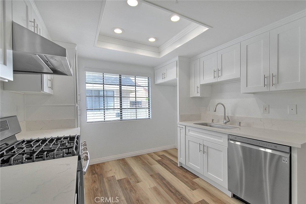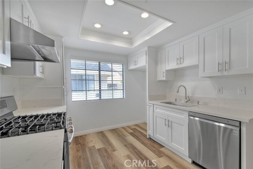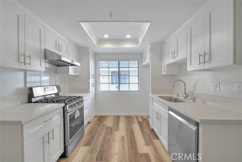 Welcome to this newly renovated condo located in a good and convenient location. 2 large bedrooms & 2 full bathroom, move-in condition. Completely renovated and upgraded in Nov. 2018. Newer kitchen and newer bathroom , kitchen with Quartz Countertops and quality cabinets, stainless steel appliances, recessed lights, ceiling fans, plantation shutter. Newer laminate wood floor throughout , tile in 2 bathroom. An open living room to the large dining room and kitchen, very bright and airy floor plan, Master suite offers newer full bath and walk-in closet. 2nd bedroom offers 2 closets. Nice lower-level condo, and super quiet inside unit. Gated underground parking, 2 reserved parking spaces, and plenty of guest parking spots. Community offers fitness room, laundry room , HOA covers water, trash, and extension building fire insurance ,Common area maintenance. Walking distance to main street, shopping, supermarket, restaurants, banks, post office, etc. Easy access to the freeway.
