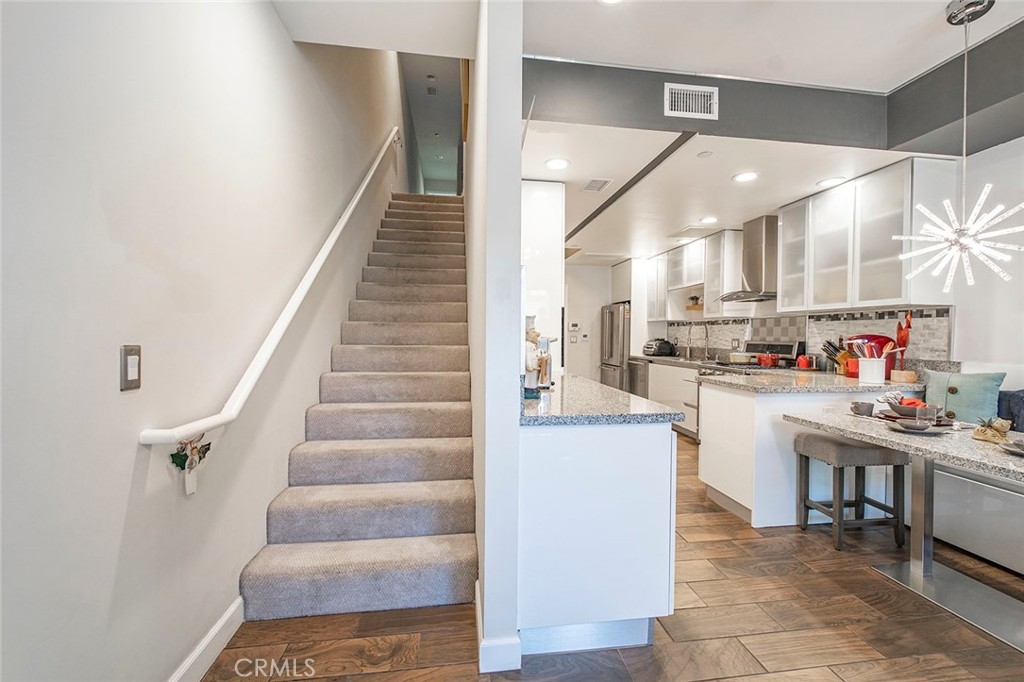 Completely updated 3 years ago with no expense spared, this luxury condominium looks like a brand new home. Amazing location right in the heart of downtown Alhambra where you can walk to a large variety of shops and restaurants. The modern kitchen comes with newer KitchenAid appliances, and modern cabinets with a gorgeous backsplash. The built-in table makes a great dining area. This more popular model has the bedrooms upstairs not down and each bedroom has plenty of closet space and elegant, upgraded bathrooms. There is a convenient office area on the second floor, perfect for those who now work from home. This elegant home flaunts designer touches throughout including a wood paneled wall in the guest bath, custom lighting, upscale appliances, Italian marble in the master bath, ceiling fans and more. The Maytag stackable washer and dryer is just 3 years old and there is an energy efficient tankless water heater. There are two parking places in the garage (spaces 171 and 209) and even an electric charge station. The courtyard has a peaceful koi pond which you can see out the window. Secure building with elevators. This is your best choice for luxury living in a 10+ walkable area.